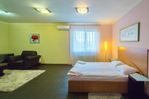 Недалеко от станции метро Нивки, в тихом районе Киева, можно поселится в Гринотеле, что привлекает гостей сочетанием современного дизайна и доступности. Отель рассчитан на 25 номеров категории Стандарт и эконом-класса, в которых могут поселится от двух до четырех гостей. Просторные номера оборудованы, в зависимости от категории, удобными кроватями, телевизорами и кондиционерами. Санузлы есть общие и индивидуальные. Бесплатный Wi-Fi по всему отелю. В гостинице находится кафе, что обслуживает с 7:00 до 23:00. На базе отеля функционирует русская баня на дровах с бассейном. Предоставляется автостоянка с видеонаблюдением. Есть возможность заказа услуг прачечной, услуги косметолога. До выставочного центра «КиевЭкспоПлаза» идти 20 мин пешком, 10 минут ехать до Золотых ворот, уже через 5 минут, можно гулять по центру. Расстояние до ж/д вокзала - 12 км, до аэропорта Борисполь - 48 км.